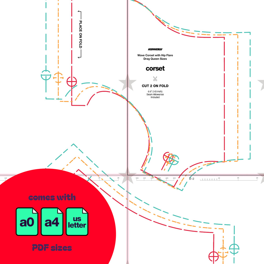 Wave Corset Sewing Pattern (Sizes XS - 2X) PDF Download - Drag Queen Costume Waist Belt Underbust Hip Flare Goth Leather Harness Fantasy